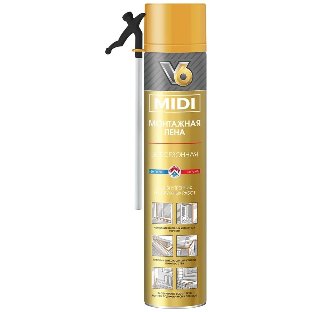 Бытовая всесезонная монтажная пена V6 560 мл 586413 используется при установке оконных и дверных рам, подоконников, изоляции линий водопровода, креплении стеновых панелей и кровельной черепицы. Дозатор обеспечивает равномерный выход пены мелкопористой структуры. Продукт применяют во время строительных и отделочных работ для герметизации щелей, заполнения сквозных трещин и пустот в каменной кладке, шумоизоляции ванн и душевых кабин, дополнительной фиксации вентиляционных систем. Состав обладает высоким уровнем адгезии к большинству строительных материалов: бетон, кирпич, штукатурка, дерево, пластик.