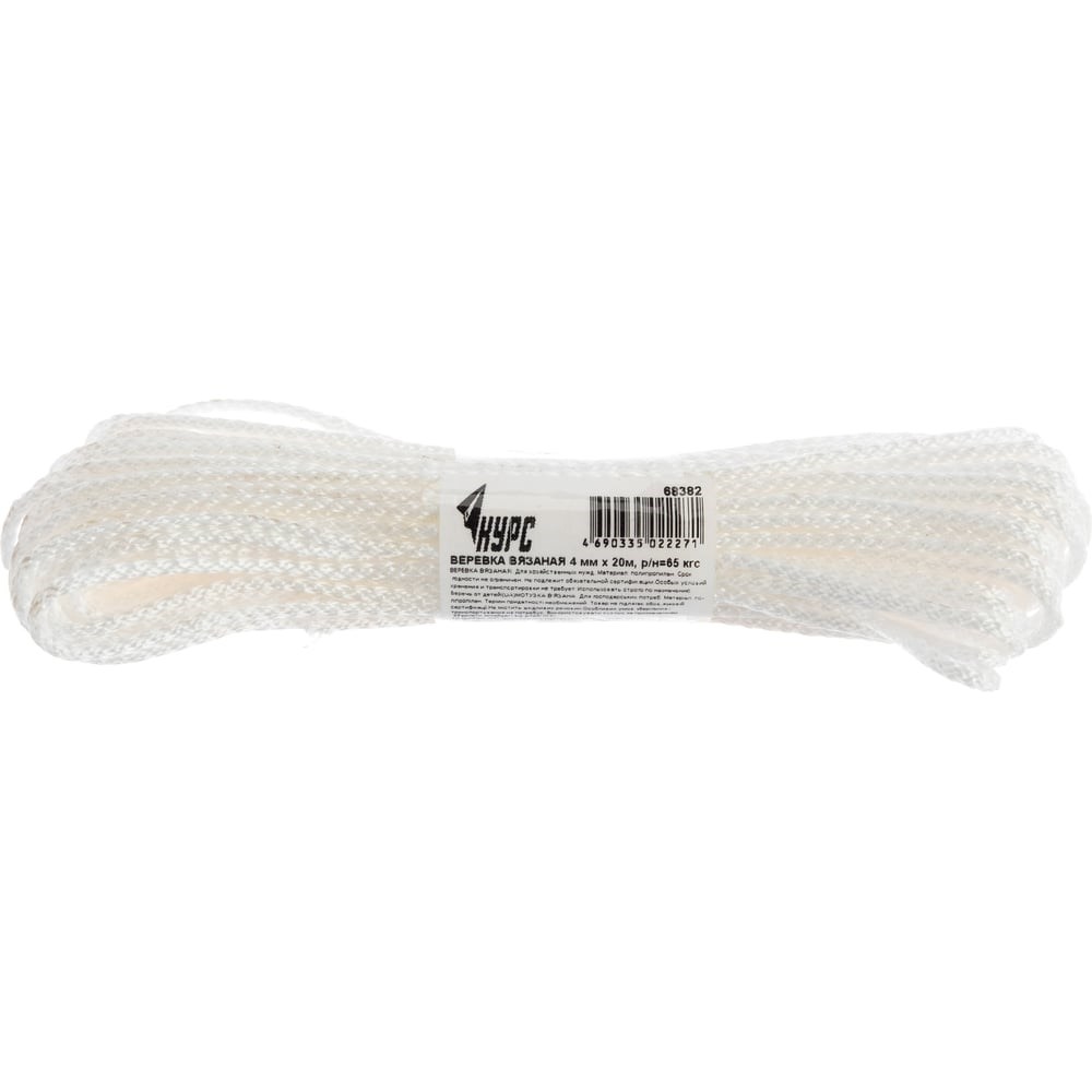 Полипропиленовая веревка (вязаная, 4 мм х 20 м, 65 кгс) КУРС 68382 представляет собой удобное такелажное оборудование. Небольшой диаметр при высокой прочности на разрыв допускает использование только со статическим натяжением. Изделие может незначительно растягиваться при максимальном усилии.