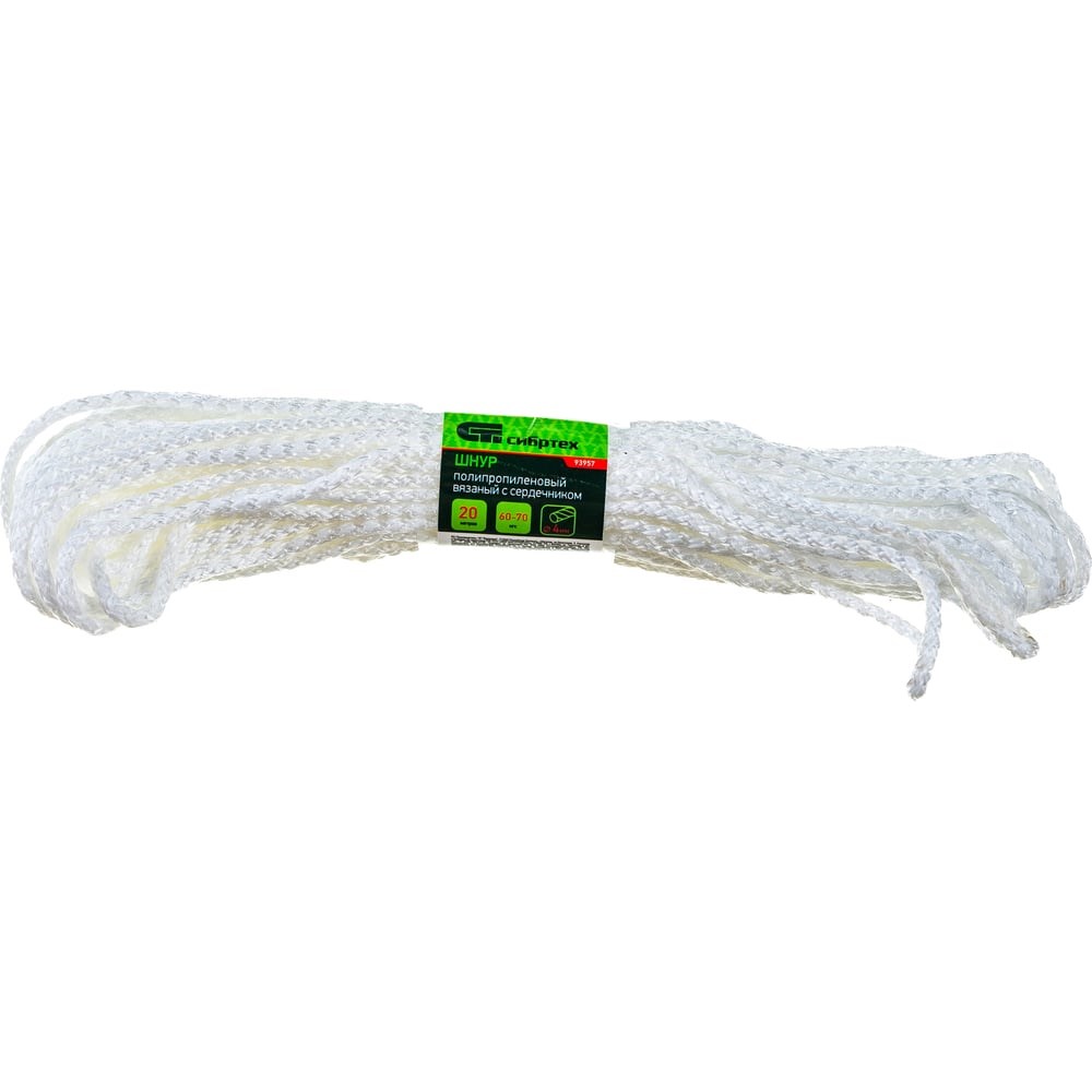 Вязаный полипропиленовый шнур с сердечником Сибртех 93957 белого цвета, диаметром 4 мм, длиной 20 м, будет полезен для хозяйственных нужд — сушки белья, связывания предметов, подвязки растений. Пригодится также в походе, на охоте или рыбалке. Благодаря сердечнику и высокопрочной оплетке вязаный шнур обладает повышенной устойчивостью к истиранию и разрыву — максимальная разрывная нагрузка составляет 60 кгс. Изделие не растягивается и не провисает под значительным весом.