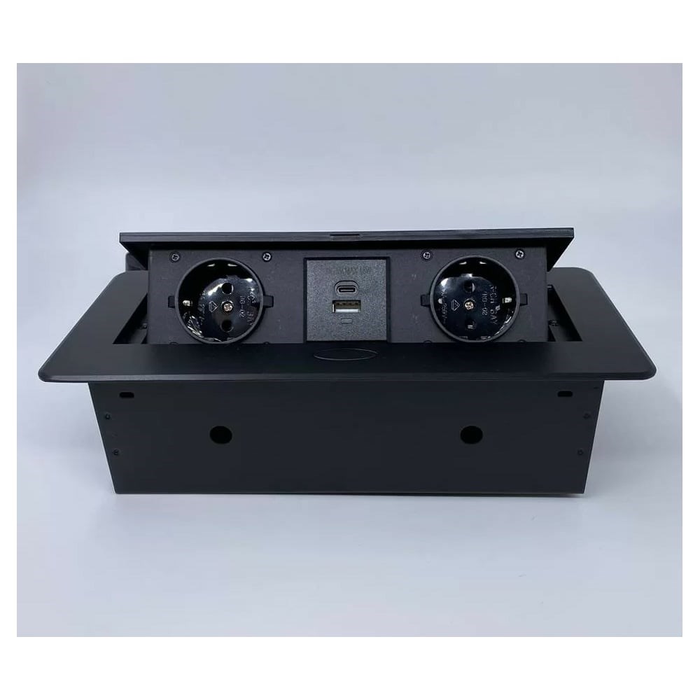 Выдвижной встраиваемый блок розеток Inrior выдвижная розетка, на 2 EURO розетки и 2 USB-A+C, черный, TORO-33-20 полностью в сборе: с внутренней проводкой, с металлической монтажной коробкой, проводом 1.8 м с вилкой. Врезное отверстие - 225х108 мм. Выдвижная горизонтальная розетка, представляет собой металлический прямоугольный розеточный блок на 2 EURO, 2 USB C + A (18W). При нажатии на кнопку на лицевой части розетки, происходит плавное открытие. Качественная порошковая окраска корпуса позволяет долгое время сохранить внешний вид нового изделия. Данная модель готова к эксплуатации вся внутренняя разводка уже сделана на заводе, в комплекте с сетевым шнуром длиной 1.8 м, необходимо только подключить изделие к розетки. Выдвижные розетки отлично подходят для установки в столешницу на кухне. В закрытом положении встраиваемая розетка образует со столешницей практически ровную поверхность. Также выдвижные розетки нашли распространение в офисах, переговорный залах, стойках обслуживания клиентов.