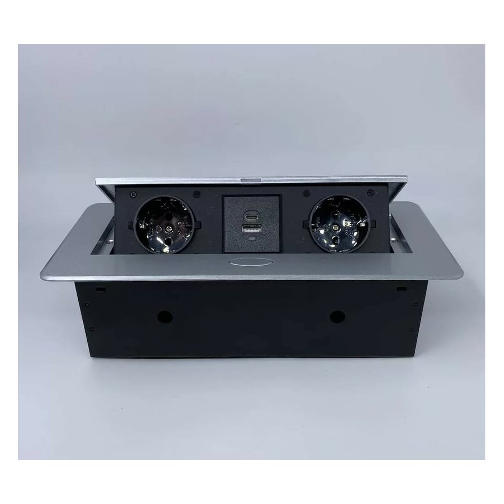Выдвижной встраиваемый блок розеток Inrior выдвижная розетка, на 2 EURO розетки и 2 USB-A+C, серый, TORO-33-80 полностью в сборе: с внутренней проводкой, с металлической монтажной коробкой, проводом 1.8 м с вилкой. Материал: Корпус, верхняя рамка, установочная коробка из металла. Врезное отверстие - 225х108 мм. Выдвижная горизонтальная розетка, представляет собой металлический прямоугольный розеточный блок на 2 EURO, 2 USB C + A (18W). При нажатии на кнопку на лицевой части розетки, происходит плавное открытие. Качественная порошковая окраска корпуса позволяет долгое время сохранить внешний вид нового изделия. Данная модель готова к эксплуатации вся внутренняя разводка уже сделана на заводе, в комплекте с сетевым шнуром длиной 1.8 м, необходимо только подключить изделие к розетки. Выдвижные розетки отлично подходят для установки в столешницу на кухне. В закрытом положении встраиваемая розетка образует со столешницей практически ровную поверхность. Также выдвижные розетки нашли распространение в офисах, переговорный залах, стойках обслуживания клиентов.