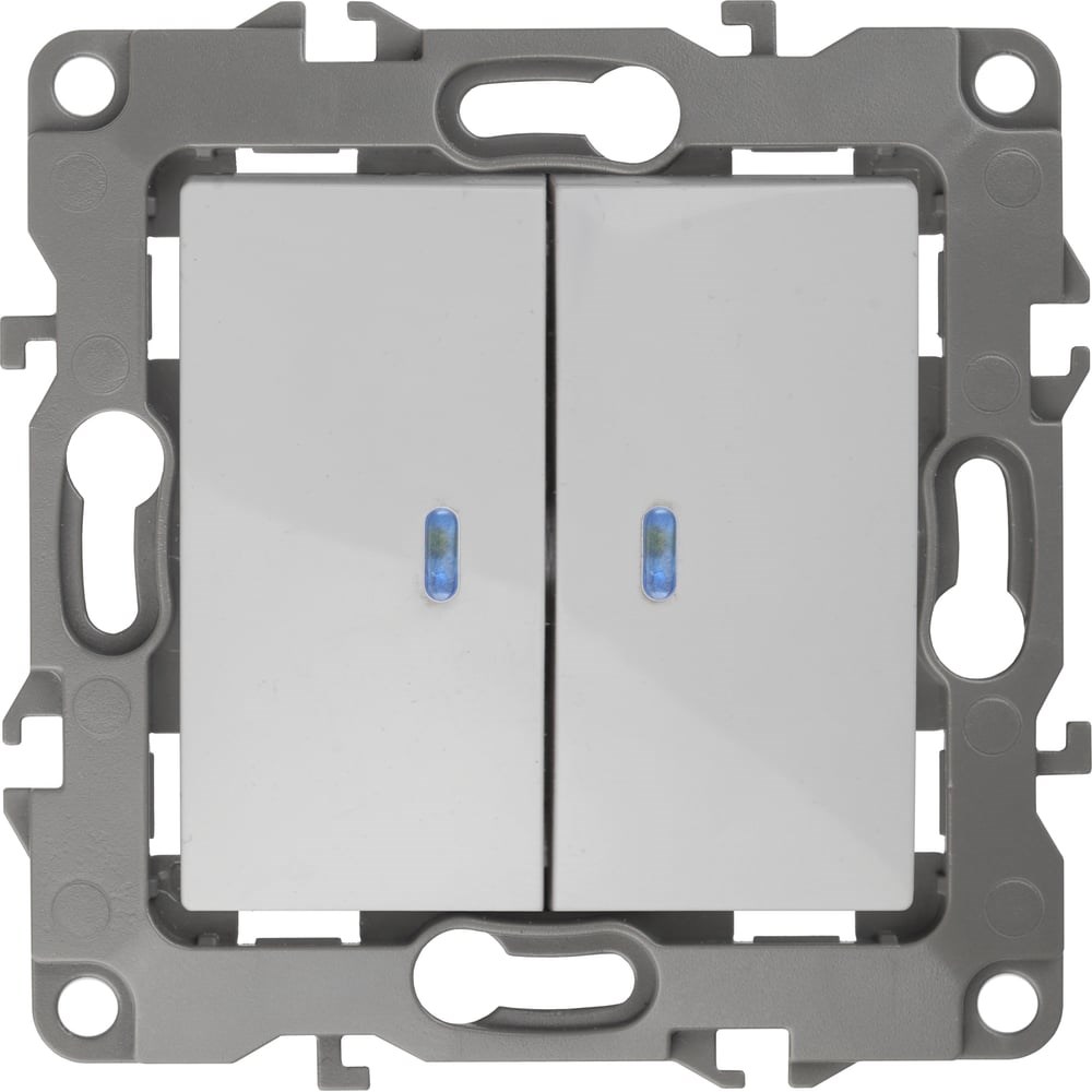 Двойной выключатель с подсветкой ЭРА 12-1105-01 10АХ-250В белый Б0014657 сделан из поликарбоната, оснащёно автоматическими клеммами для быстрой и надёжной фиксации жил кабеля в механизме. Парные клеммы обеспечивают соединение шлейфом. Монтаж в подрозетник производится и на лапки, и на винты. Рамка приобретается отдельно.