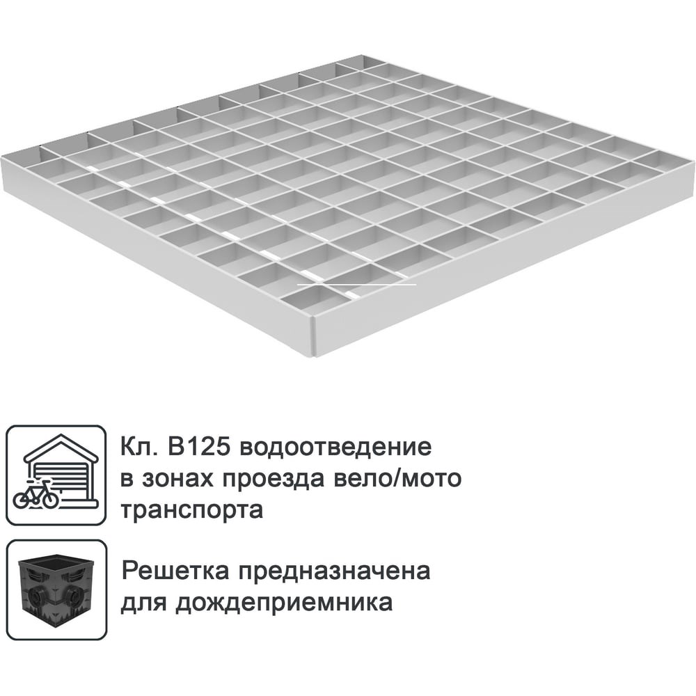 Решетка стальная оцинкованная класса В125 предназначена для покрытия дождеприемника Gidrolica Point 300х300х300 мм. Прочная решетка, выдерживающая нагрузку в зонах мото и велотранспорта, а также применима и в пешеходных зонах. Позволяет пропускать воды, задерживая крупный мусор. Устанавливается на тротуарах, около жилых домов, торговых центров, дачных участках. Изготовлена из оцинкованной стали, устойчивой к влаге, коррозии и деформации.