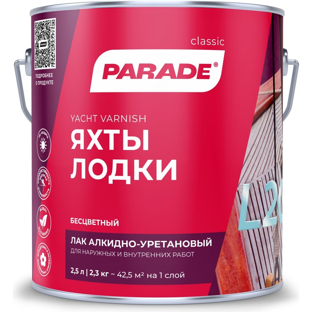 Лак яхтный алкидно-уретановый PARADE L20 Яхты & Лодки полуматовый 2,5 л Россия 90001484885 - высококачественный однокомпонентный лак на алкидно-уретановой основе. Образует долговечное износостойкое покрытие с превосходными защитными свойствами и исключительной стойкостью к внешним условиям. Создает надежную защиту деревянным поверхностям, находящимся в неблагоприятных климатических условиях. Обладает прекрасной эластичностью и сопротивляемостью к ударам, морской воде, ультрафиолетовому излучению, влаге, перепадам температуры.