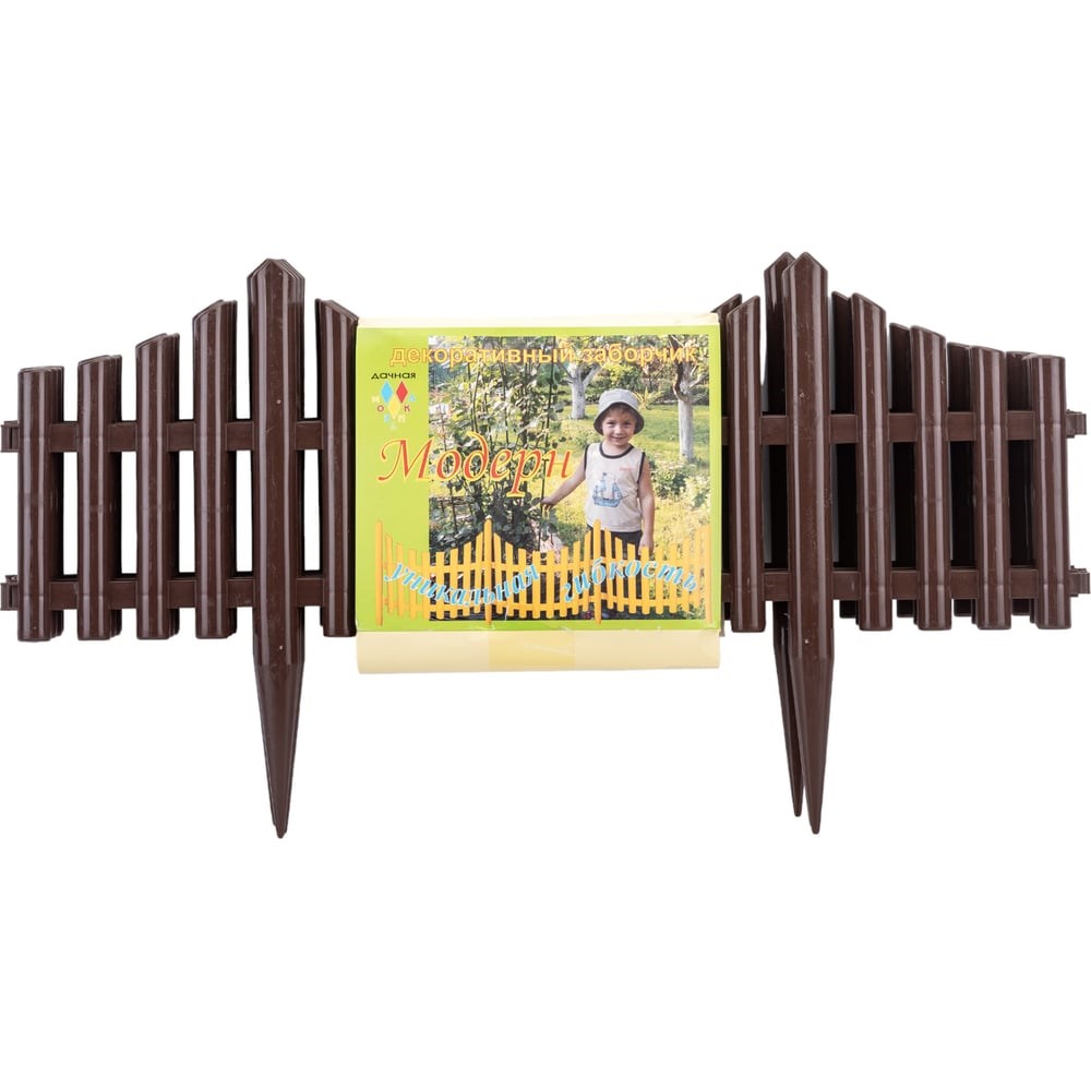 Заборчик Дачная мозаика "Модерн" декоративный темно-коричневый штакетник 10608 способен эффектно украсить практически любой участок. Помимо декоративной функции модель можно использовать по прямому назначению - для защиты газонов, грядок и клумб от набегов мелких грызунов или домашних животных.