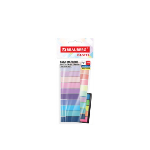 Набор пластиковых закладок включает 20 пастельных и 5 неоновых цветов размером 45х12 мм, состоит из 500 листов, по 20 закладок каждого цвета. Легко клеятся к любой поверхности и не оставляют следов. Материал закладок позволяет делать надписи ручкой и карандашом. Уложены на пластиковом основании. Поставляются в пакете с европодвесом.