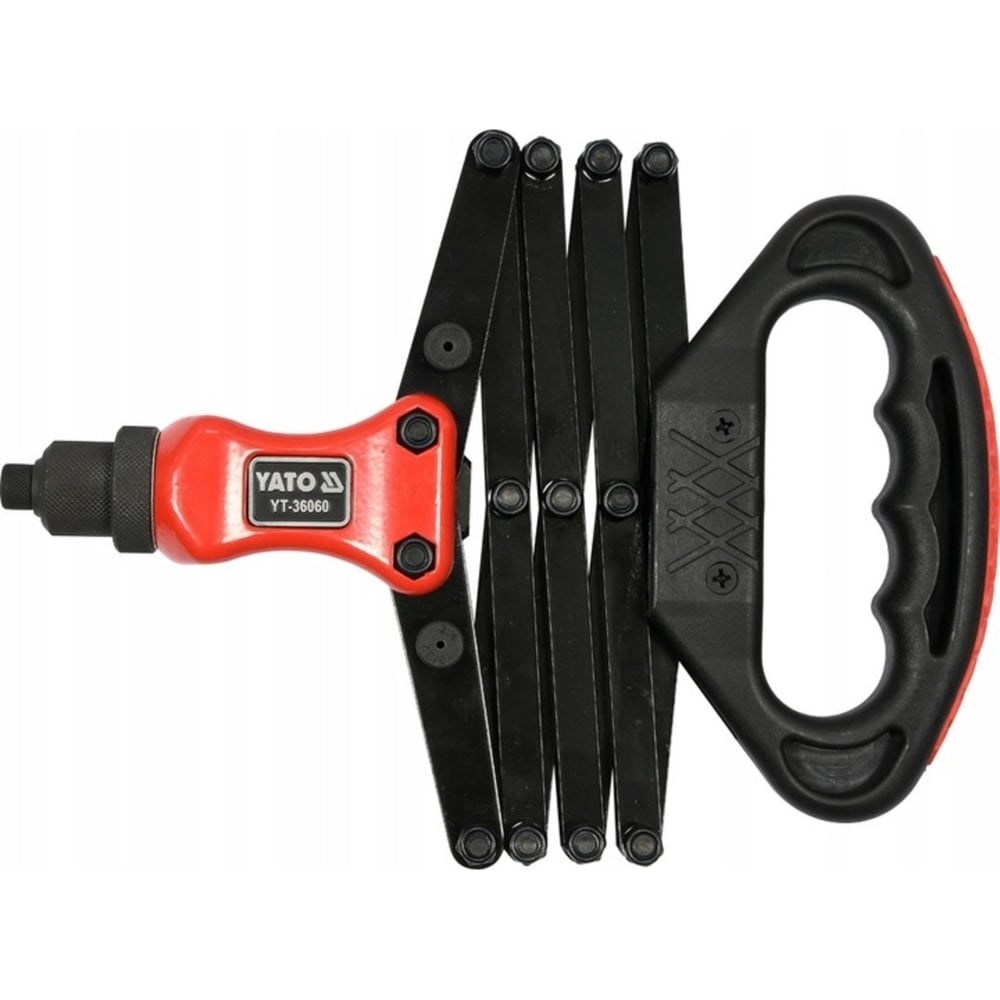 Заклепочник-гармошка 2,4-6,4мм YATO YT-36060 применяется при соединении нескольких листовых деталей. Использование заклепок различных усилий требует предварительной установки насадки нужного размера. Конструкция удобна в использовании и не требует приложения большой силы. Длина варьируется от 250 до 810 мм.