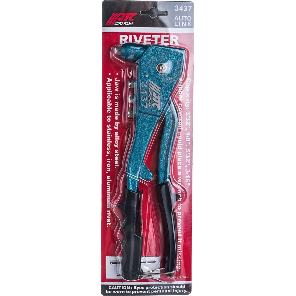 Заклепочник JTC 3437 - это компактное ручное приспособление, которое поможет быстро и качественно соединить различные детали и элементы посредством клепок разного диаметра (3/32", 1/8", 5/32", 3/16"). Инструмент отличается высокой прочностью и износостойкостью, что обеспечивает ему продолжительный рабочий ресурс. Данная модель не занимает много места, её удобно хранить и транспортировать.