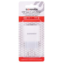 Зарядное устройство быстрое сетевое (220 В) SONNEN, Type-C PD 20 Вт, 3 A, белое, 455507