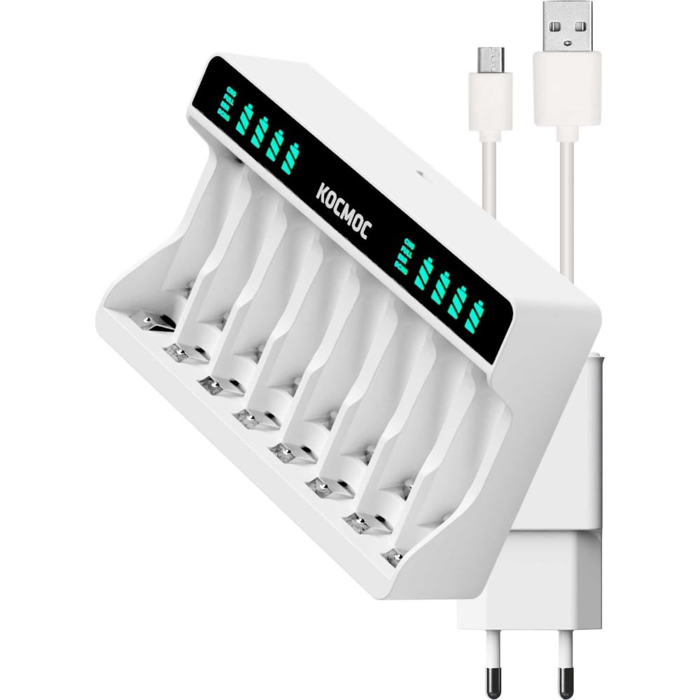Зарядное устройство для аккумуляторных батареек КОСМОС это надежное и удобное решение для зарядки аккумуляторов. Вы сможете заряжать до 8 аккумуляторов одновременно, что позволит вам всегда иметь запас энергии для вашей электроники. Автоматический режим зарядки позволит вам заряжать NI-MH аккумуляторы AA, AAA. Индикация на корпусе устройства поможет вам контролировать процесс зарядки. Зарядное устройство для аккумуляторных батареек КОСМОС - отличный подарок для любителей электроники!Автоматическое зарядное устройство с индикацией заряда каждого канала8 независимых слотов для АА ААА аккумуляторов с индивидуальной индикациейДополнительно комплектуется кабелем USB:Type-C и блоком питания 2.1АБлок питания и кабель можно дополнительно использовать как зарядное устройство для смартфона.
