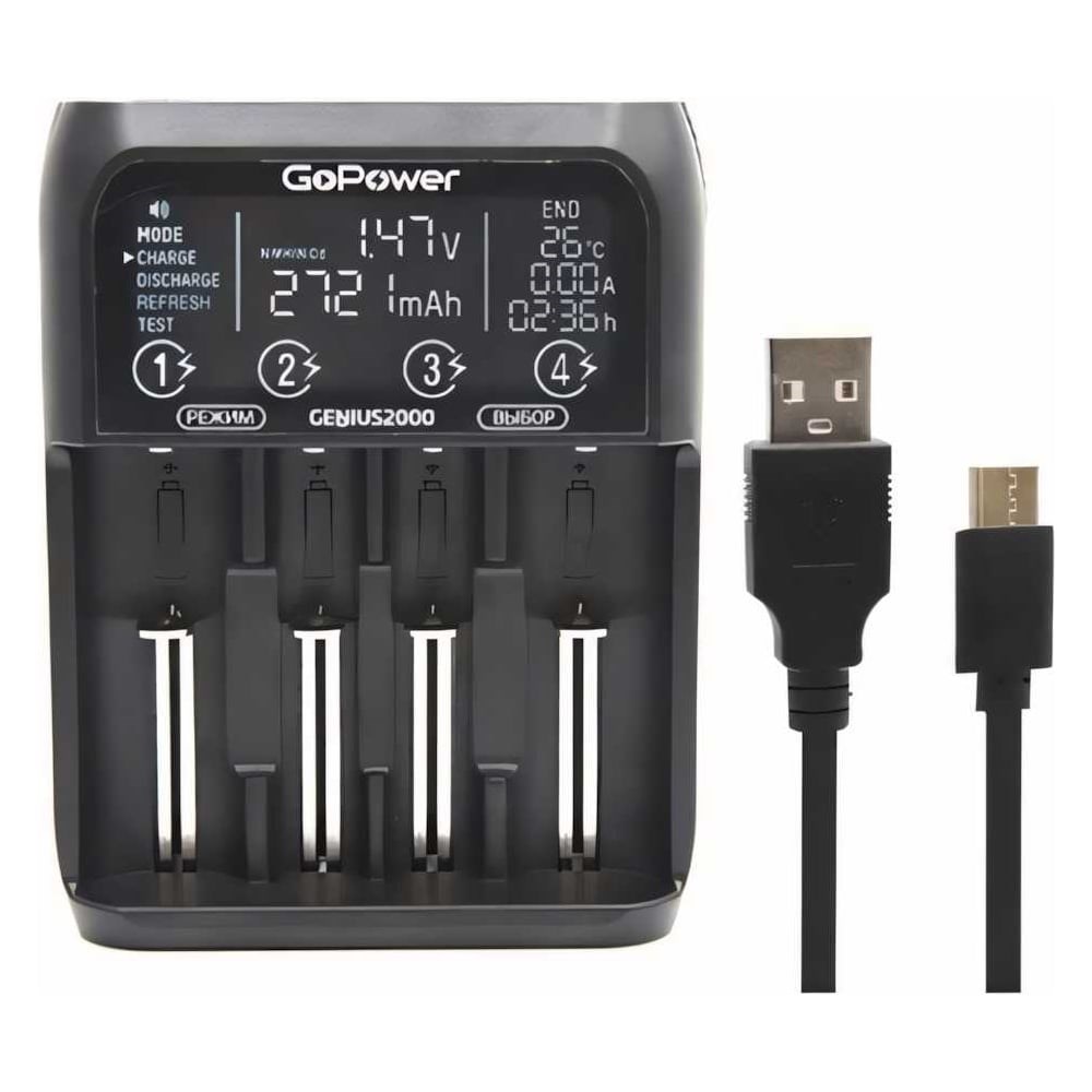 Зарядное устройство GoPower для аккумуляторов Genius2000 Ni-MH/Ni-Cd/Li-ion/IMR/LiFePO4 4 слота (1/40) 00-00017019 работает с любыми цилиндрическими аккумуляторами: Ni-Cd, Ni-MH, Li-ion, IMR, LiFePO4. Многофункциональность - 4 режима работы: заряд, разряд, тестирование и тренировка аккумуляторов. Информативный сенсорный дисплей показывает одновременно: Тип аккумулятора, Режим, Емкость- Напряжение- Температура – Ток заряда/разряда-Время заряда/ разряда. Максимальная совместимость: 1-4 Ni-Cd / Ni-MH аккумулятора размера A, AA, AAA, AAAA, C, SC, D; 1-4 Li-ion (IMR/INR/ICR) аккумулятора 3,6В/ 3,7 В и 3,2 В LiFePO4 аккумулятора размера 10340, 10350, 10440, 10500, 12340, 12500, 12650, 13650, 13500, 13450, 14350, 14500, 14650, 16340 (RCR123A), 18650.