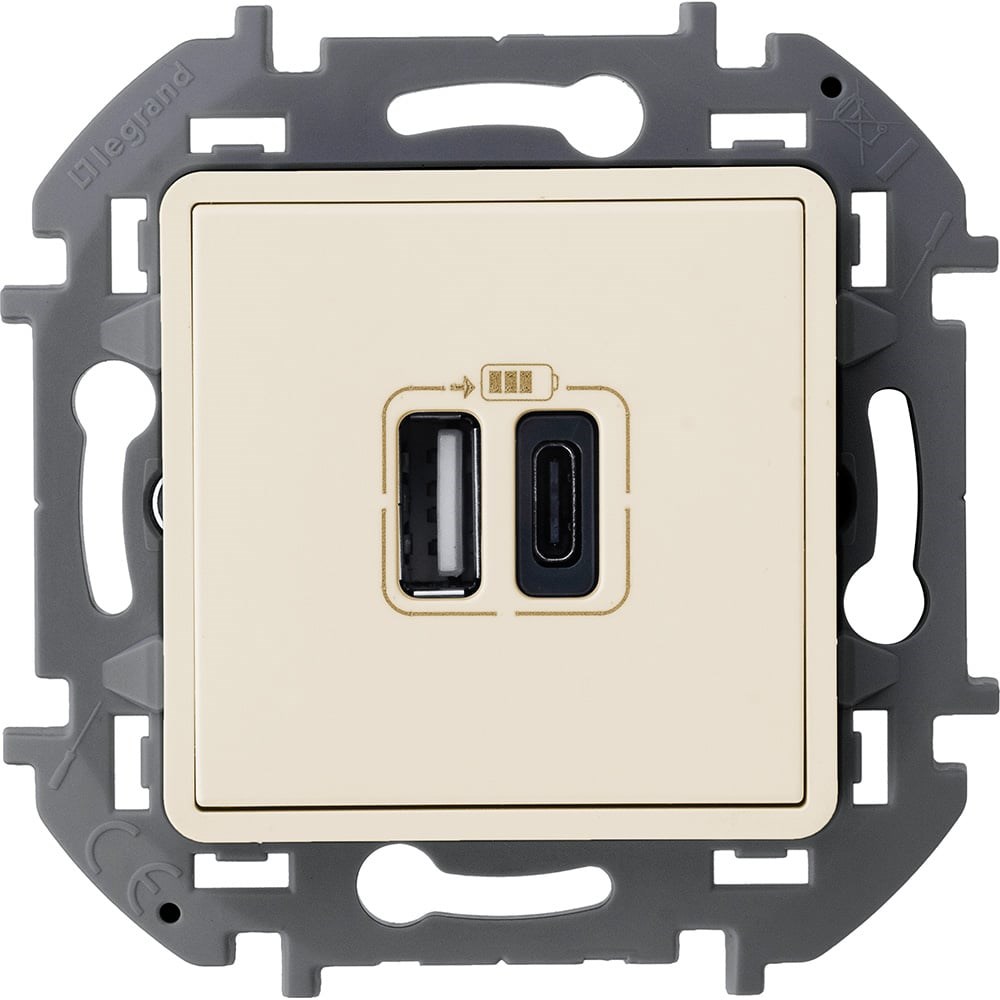Зарядное устройство с двумя USB-разьемами Legrand A-C 240В/5В 3000мА INSPIRIA слоновая кость 673761 применяется для непосредственной зарядки одного или двух мобильных устройств. Увеличенный до 3000мА зарядный ток способствует сокращению времени заряда мобильных устройств. Разьемы двух стандартов - классический тип А и современный реверсивный тип С для максимальной гибкости и совместимости с любыми гаджетами. Возможна одновременная зарядка двух устройств Стандартное подключение к электросети двумя проводами (фаза и нейтраль) позволяет легко заменить стандартную электрическую розетку Подсоединение проводов электросети с помощью винтовых клемм.