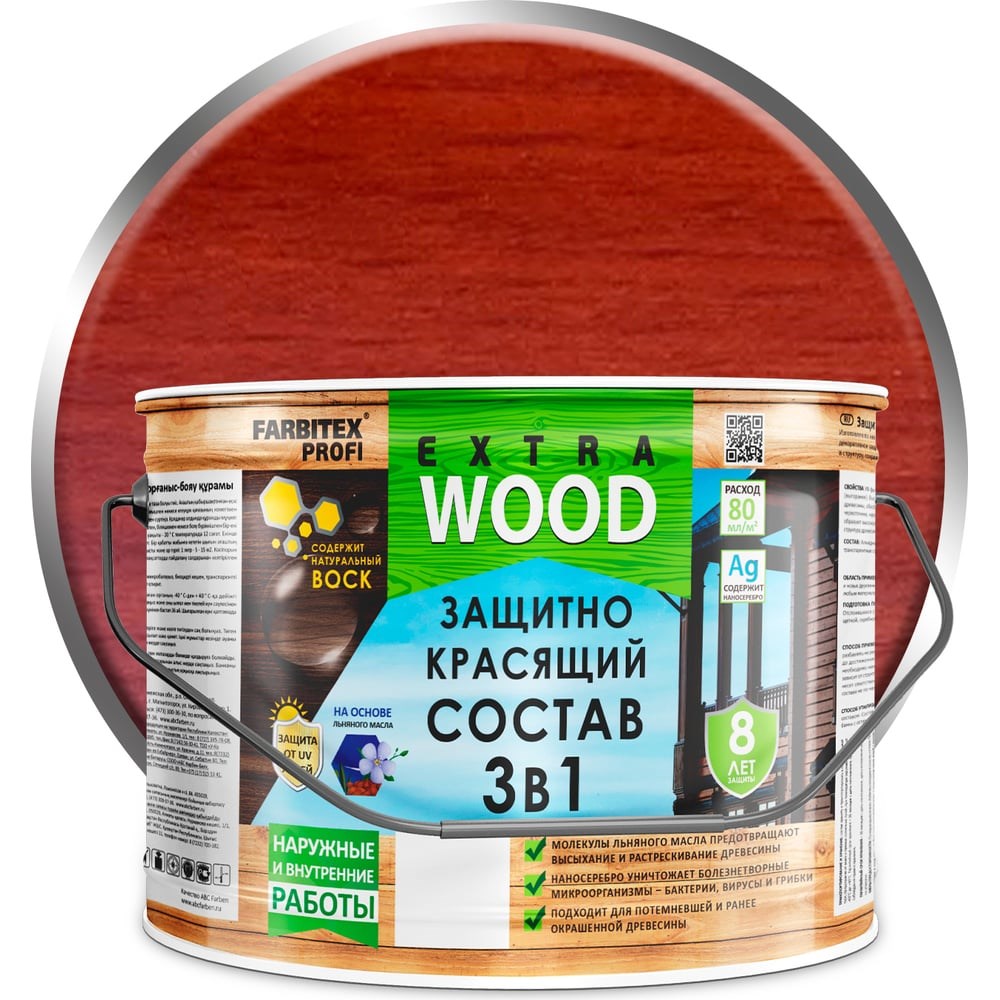 Защитно-красящий состав 3в1 FARBITEX EXTRA (каштан; 9 л) 4300007645 предназначен для обработки старых и новых деревянных поверхностей (фасады, окна, двери, элементы интерьеров), а также любых материалов на основе древесины (ДВП, ДСП, фанера, клееный брус). УФ-фильтр обеспечивает длительную и надежную защиту от солнечного излучения (выгорания). Высокоэффективные фунгицидные добавки, проникающие глубоко в поры древесины, обеспечивают надежную защиту от биологических повреждений (гниль, синева, червоточина, насекомые) и продлевают ее срок службы. Льняное масло и натуральный воск образуют высокоэластичное покрытие с грязе-водоотталкивающими свойствами, подчеркивая структуру древесины. Внимание, изображение товара может отличаться от реального! Верные параметры указаны в технических характеристиках товара.