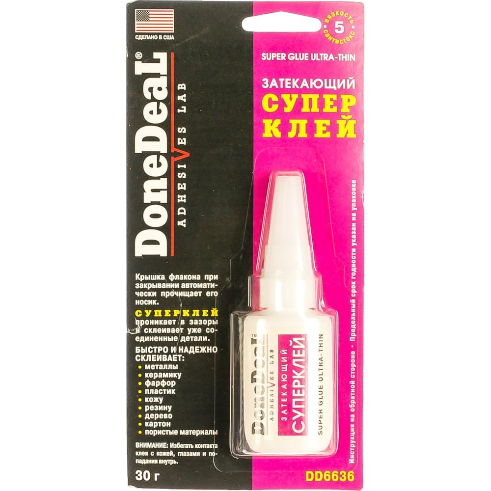 Затекающий суперклей Done Deal DD6636 используют во время ремонтных работ для надежного склеивания различных деталей из черных и цветных металлов, керамики, пластмассы, резины, фарфора, кожи, древесины, картона и других пористых материалов. Состав образует прочный клеевой шов, обладает высокой текучестью, смачиваемостью и адгезией. Клей проникает в зазоры и застывает в течении 30 секунд после нанесения, позволяя значительно сократить и упростить процесс монтажа.