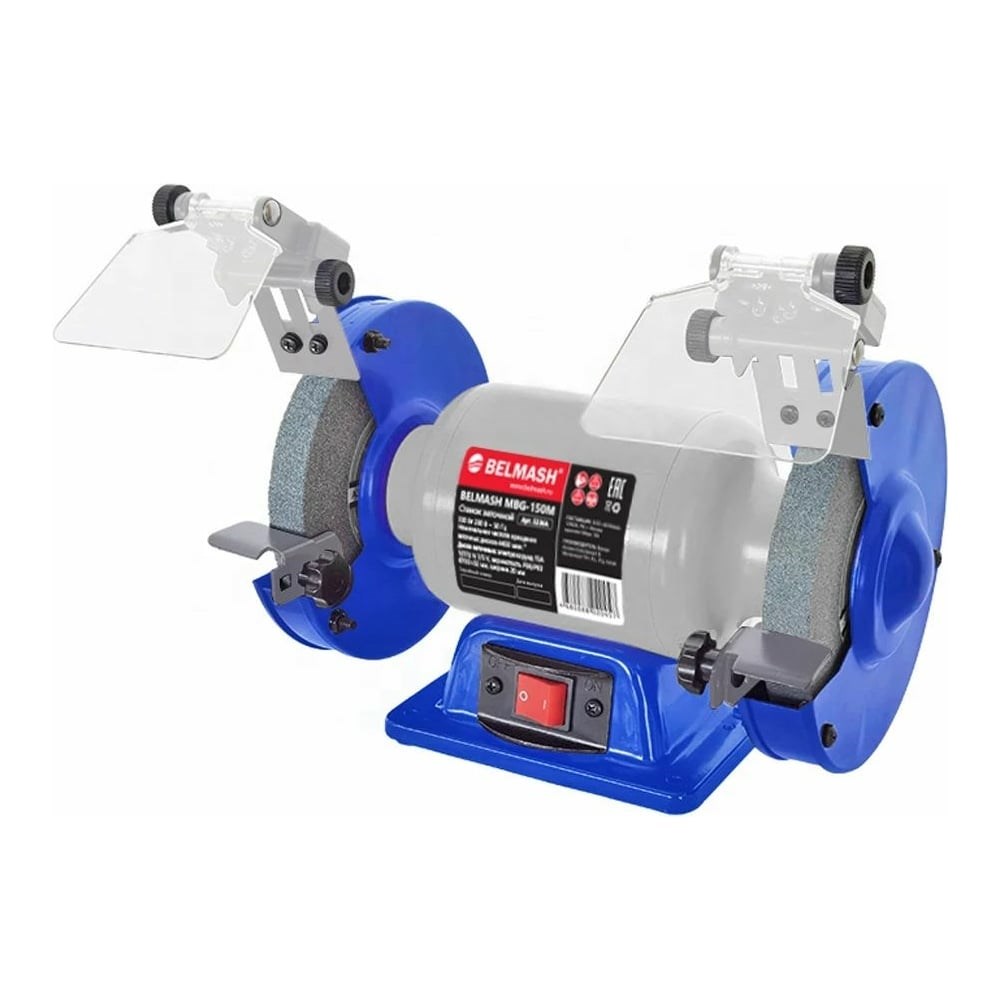 Заточной станок Белмаш MBG-150M S236A предназначен для затачивания режущих инструментов при помощи вертикально вращающихся заточных дисков. Модель оснащена асинхронным двигателем мощностью 500 Вт. По обе стороны от двигателя установлены заточные диски диаметром 150 мм и шириной 20 мм с различной зернистостью. Диски изготовлены из нормального электрокорунда (15А). Такой абразив используется для восстановления эксплуатационных свойств ручного инструмента, такого как ножи, топоры, стамески и т. п.; для снятия заусенцев, фасок, обдирки на небольших заготовках. Оба диска оснащены подсветкой, рабочими упорами (подручниками), защитными кожухами (листовая сталь), искрозащитными экранами (пластик). Основание станка выполнено из качественной стали, что обеспечивает прочность и устойчивость. На переднюю часть станины выведен выключатель. Имеются отверстия для крепления к верстаку.