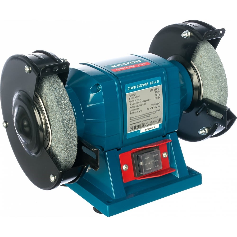 Заточной станок Кратон BG 14-01 4 02 03 013 - классический агрегат, который будет полезен на строительной площадке или в мастерской. Представляет собой электрическую точильную машину с двумя упорами для удобного обслуживания инструмента. Диски прикрыты прозрачными щитками, обеспечивающими безопасность оператора при работе. Размеры точильного диска: 125х16х32 мм.