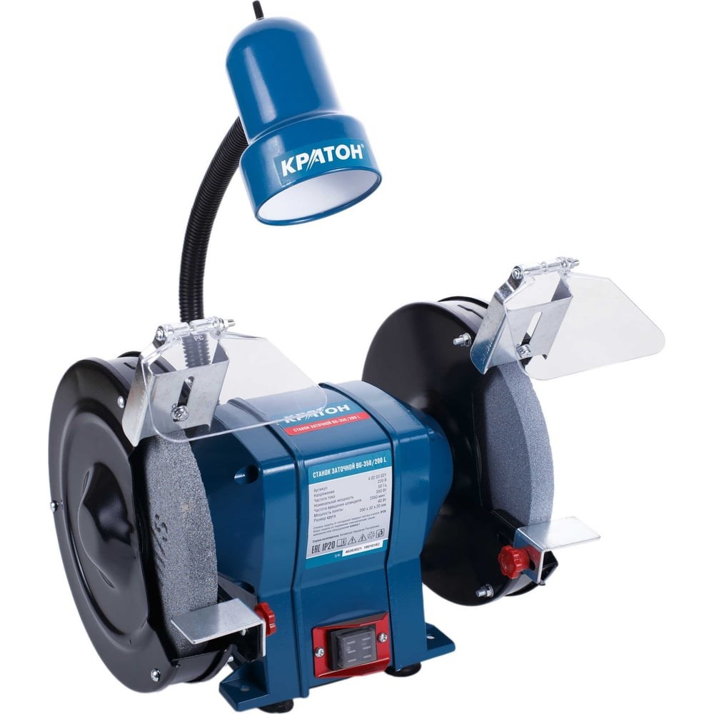 Заточной станок оборудован светильником для подсветки рабочей зоны. Аппарат оснащен надежным асинхронным двигателем, который имеет низкие показатели шума и вибрации во время работы. Диаметр установленных шлифовальных кругов - 200 мм. Станок рекомендуется для обточки и шлифовки различных предметов, а также заточки режущего инструмента.