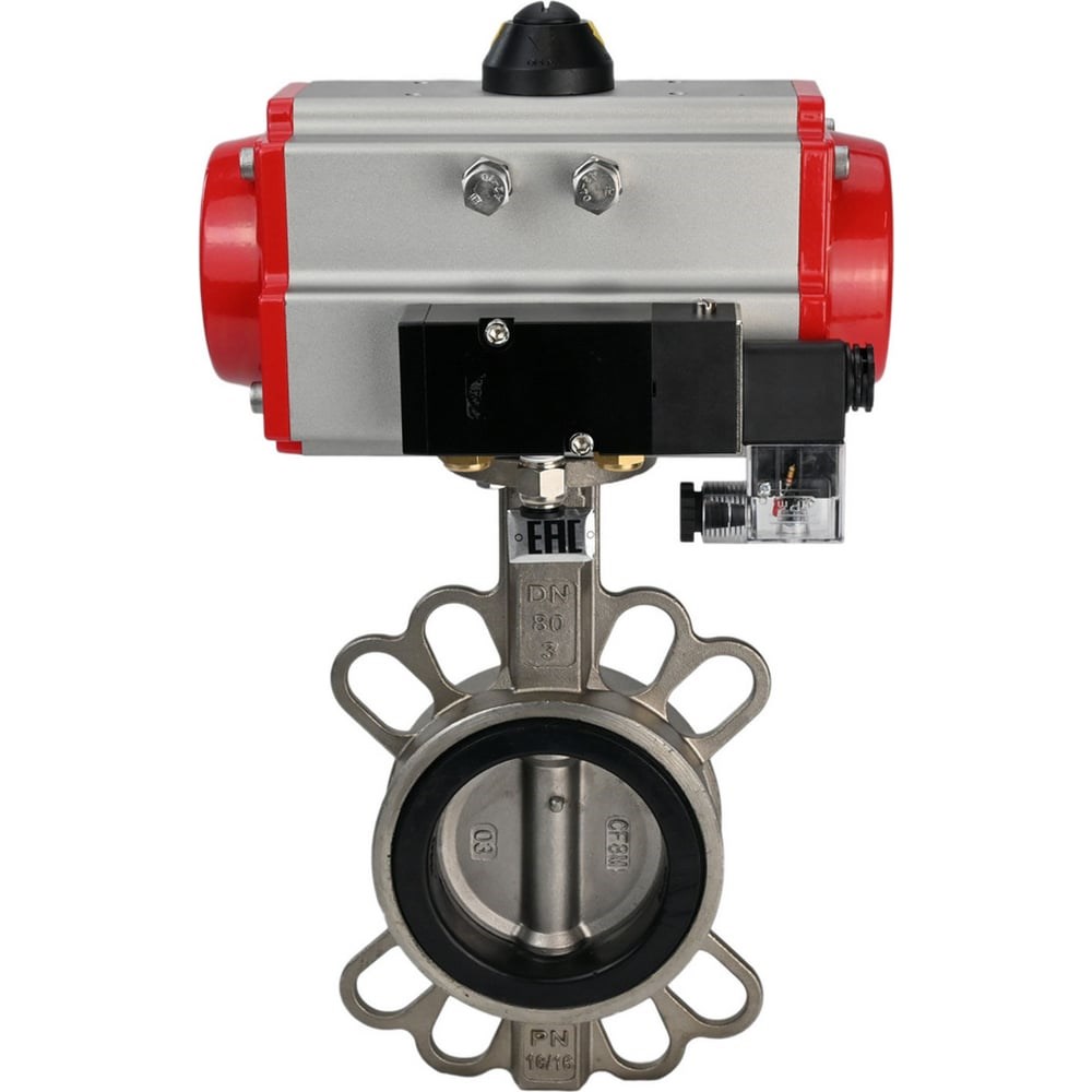Затвор дисковый поворотный DN.ru 316L-316L-EPDM с пневмоприводом SA-083, пневмораспределителем PND2-S1EM-52-1NC-J08-24VDC предназначен для использования в качестве запорной или регулирующей арматуры для управления потоками в системах теплоснабжения, водоснабжения, в технологических процессах пищевой, химической, нефтегазовой, целлюлозно-бумажной и других отраслях промышленности. Параметры затвора: Температура рабочей среды: от -20⁰C до +120⁰C Рабочая среда: вода, воздух без примесей масла и жира, иные среды нейтральные к материалу Температура окружающей среды: от -40⁰C до +120⁰C Класс герметичности: A ГОСТ 9544-2015 Присоединение к трубопроводу: межфланцевое Материал корпуса, диска: нержавеющая сталь AISI316L Материал уплотнения: EPDM Строительная длина: 43 мм Отверстия на ответных фланцах: 4х19 мм, на затворе параметры могут отличаться Параметры пневмопривода с возвратными пружинами: Рабочее давление: 2-8 бар Рабочая среда: фильтр. сжатый воздух Темп. окружающей среды: от –20⁰C до +80⁰C Крутящий момент (возврат пружин 0°): 31.6 Нм Параметры пневмораспределителя: Рабочее давление: 1.5-8 бар Температура окружающей среды: от 0°C до +60°C Напряжение: 24В Ручное дублирование: есть Степень защиты: IP65 Товар может отличаться от представленного на фото, при выборе ориентируйтесь на технические характеристики.