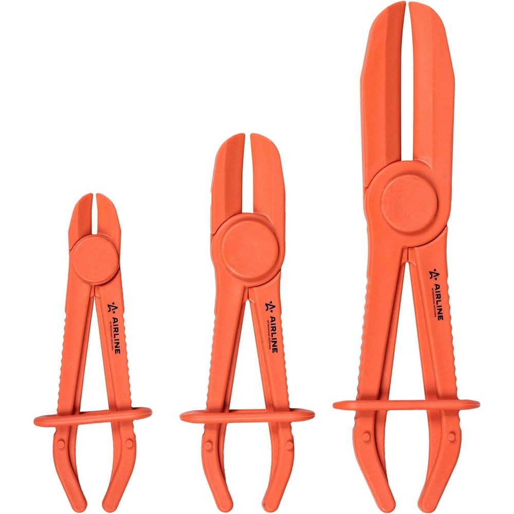 Зажимы для шлангов AIRLINE с фиксатором, набор 3 шт. D 11-60 мм ATAE001 используются при ремонтных работах для пережатия шлангов тормозной и топливной систем, системы охлаждения и ГУР. Инструмент обеспечивает надёжное сжатие шлангов без их повреждений. Фиксатор на ручке позволяет зафиксировать зажим на шланге в зажатом состоянии. Зажимы выполнены из прочного нейлона, что гарантирует долгий срок их службы. Закруглённый рабочий профиль зажимных губок исключает повреждение шланга. Рабочий ход зажимов: 11-19 мм, 22-42 мм, 22-60 мм.