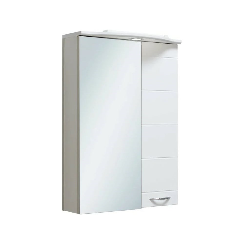 Зеркальный шкаф RUNO Кипарис 50 00000000800 имеет две распашные дверцы: слева с зеркальным фасадом, справа - с белым. В каждом отделении по 2 внутренних полки. Оборудован одним врезным светодиодным светильником 220 В, розеткой с выключателем, петлями со встроенным доводчиком и ручкой.
