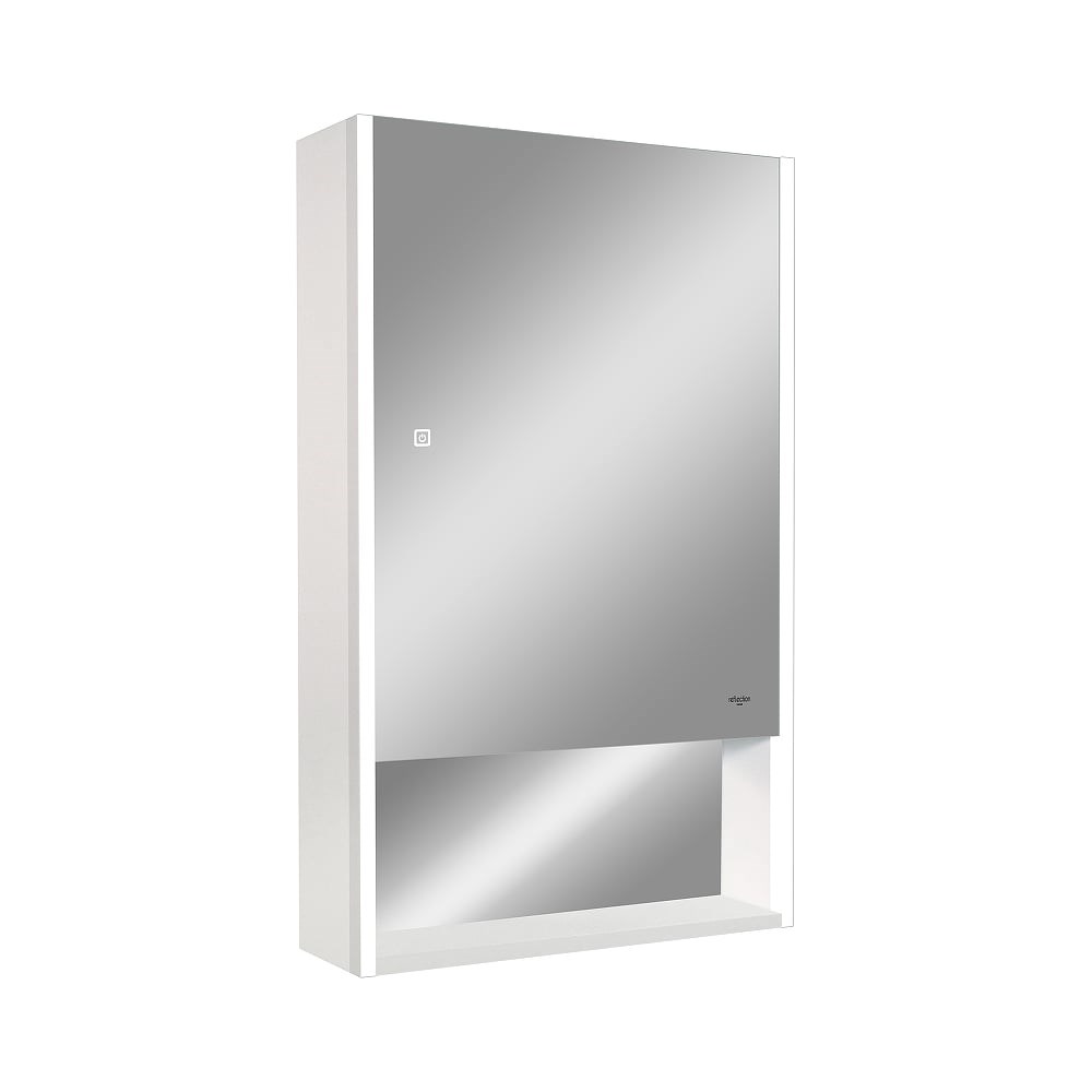 Зеркальный шкаф для ванной с LED подсветкой Reflection прекрасно впишется в современный интерьер и повысит уровень комфорта ванной комнаты. Сенсорный выключатель срабатывает при легком касании руки. Зеркало дает четкое отражение, которое может быть подсвечено встроенной по периметру светодиодной лентой. Стеклянные полки легко регулируются по высоте, а розетка позволит удобно использовать электроприборы. Хромированные крепления не ржавеют при длительной эксплуатации в условиях повышенной влажности. Защита по стандарту IP44 обеспечивает безопасное использование устройства в условиях повышенной влажности.