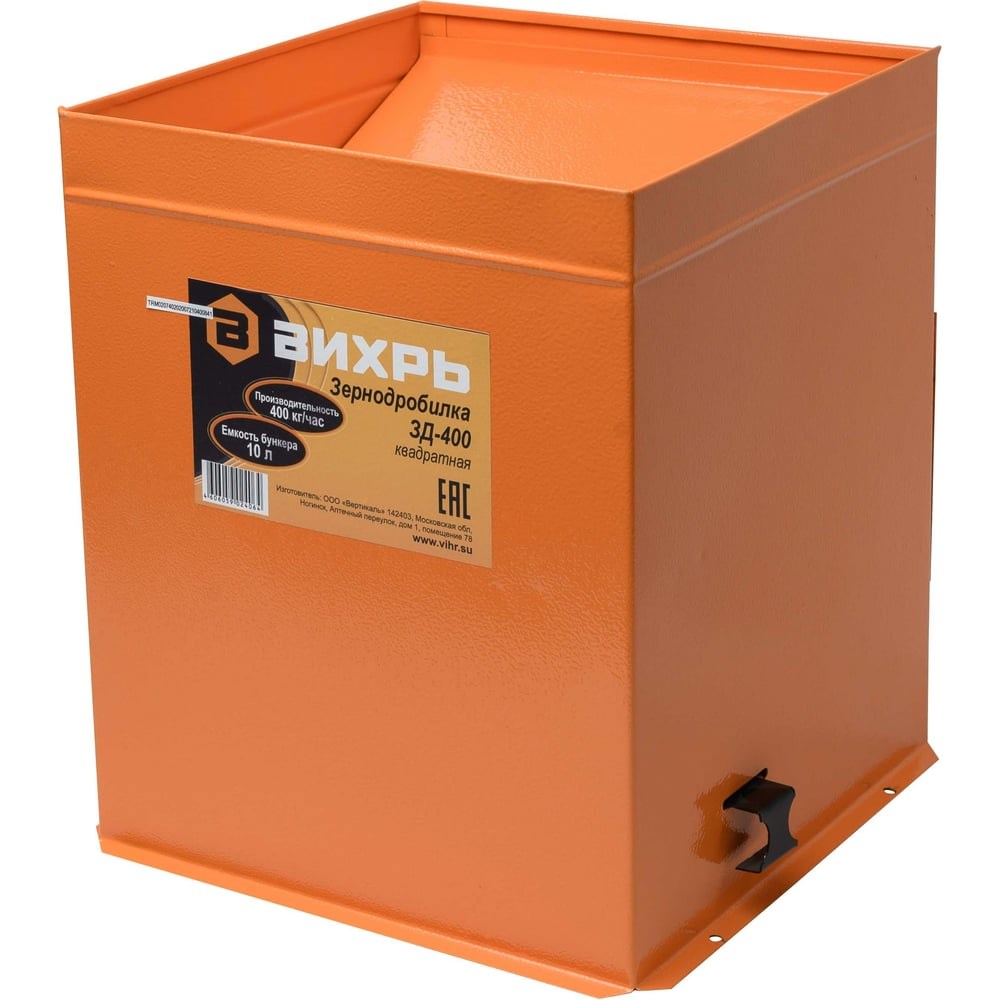 Измельчитель зерна ВИХРЬ ЗД-400 - модель зернодробилки повышенной производительности для личного подсобного хозяйства и фермерских хозяйств среднего размера. Применяется для дробления сухих сыпучих кормов для сельскохозяйственных животных: фуражного зерна, масличных культур, травяных гранул, комбикорма и т.д.Корпус измельчителя зерна ВИХРЬ ЗД-400 имеет компактные размеры, выполнен из окрашенного металла и устойчив к неблагоприятным воздействиям. Вес аппарата – 6,4 кг, его легко передвигать и переворачивать для обслуживания. Встроенный бункер объемом 10 л вмещает в себя ведро фуража. Однофазный коллекторный электродвигатель мощностью 1550 Вт производит до 400 кг дробленки в час. Зерно измельчается ножом на скорости вращения 12000 об/мин и пробивается через сито. Подача кормов в камеру измельчения регулируется заслонкой. Фракция размола мелкая.Обслуживание зернодробилки сводится к регулярной очистке загрузочного отверстия, ножа и сита от мучной пыли, а также проверки степени их износа и замены при необходимости.