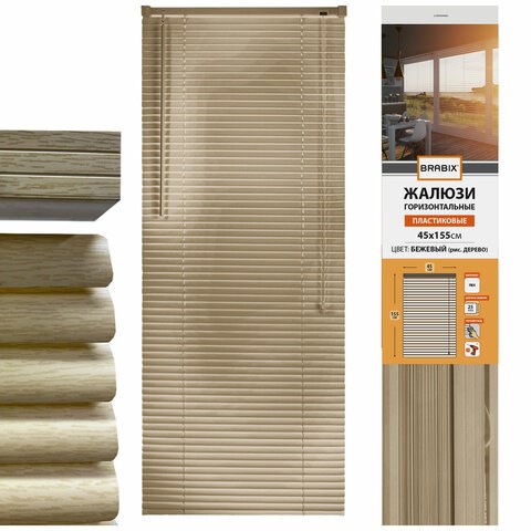 Жалюзи горизонтальные BRABIX 45х155 см, ПЛАСТИК, под дерево, бежевый, 608617