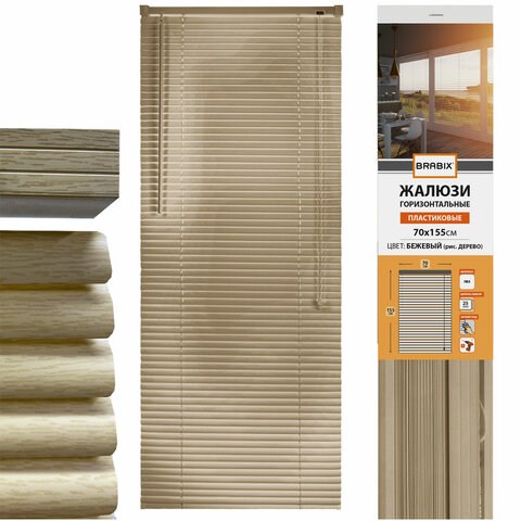 Жалюзи горизонтальные BRABIX 70х155 см, ПЛАСТИК, под дерево, бежевый, 608622