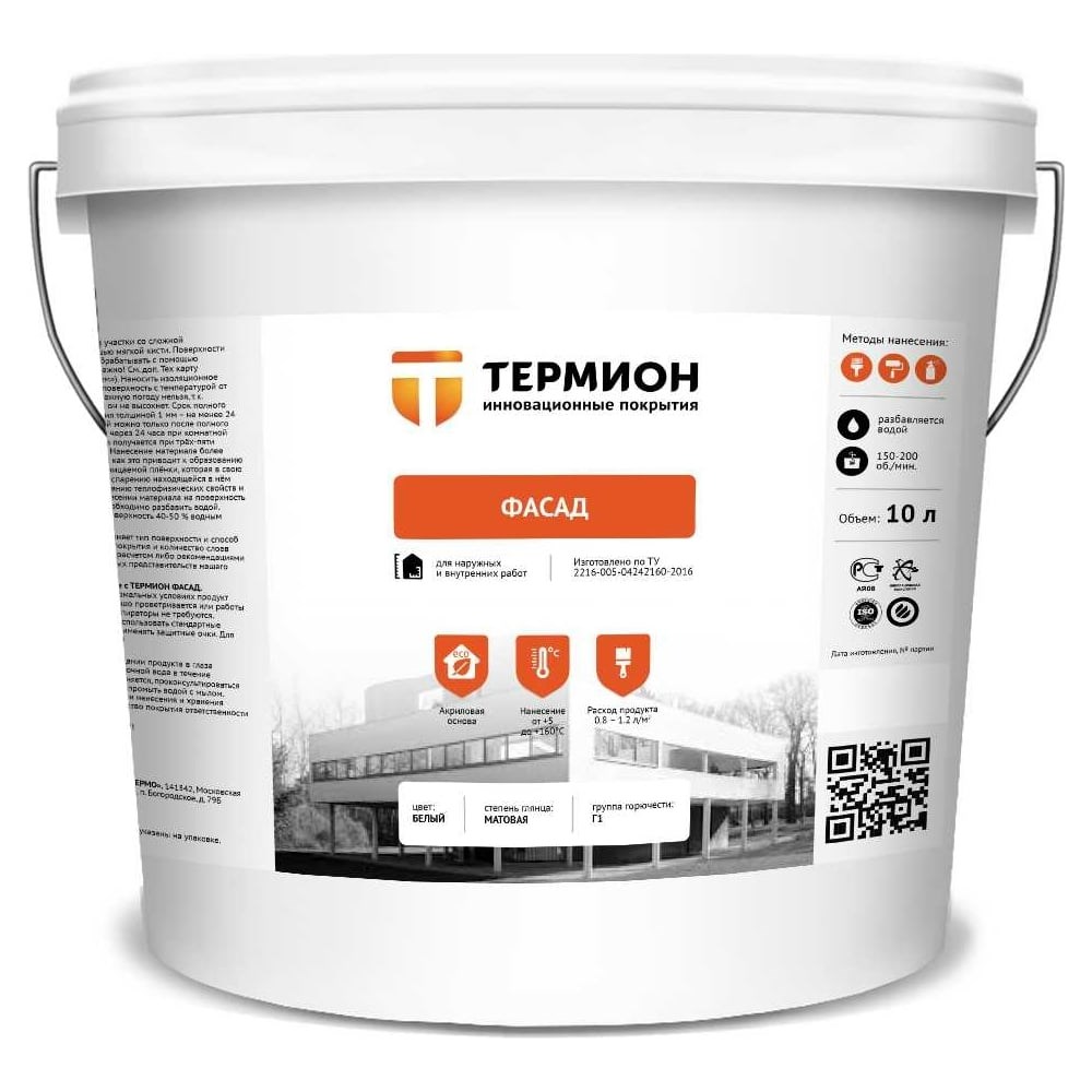 Жидкая теплоизоляция ТЕРМИОН Фасад 10 л 21168502 - модификация жидкой теплоизоляции разработана специально для бетонных и кирпичных поверхностей. Благодаря высоким теплоотражающим свойствам, станет идеальным решением в области строительной профессиональной теплоизоляции. Благодаря возможности колеровки теплоизолированные поверхности приобретут современный эстетический внешний вид. «ТЕРМИОН ФАСАД » высокоэффективна в устранении промерзаний, конденсатообразований, защищает от теплопотерь, содержит биоцидные добавки против грибка и плесени. Не имеет токсичного запаха, безопасна для окружающих. В отличии от остальных модификаций серии «ТЕРМИОН» , «ТЕРМИОН ФАСАД» имеет повышенный коэффициент паропроницаемости, а следовательно в стеновых конструкциях, утеплённых нашим материалом, не накапливается влага и из помещения прекрасно выходят пары. Но при этом она обладает гидрофобными свойствами, а следовательно, конструкция покрытая данным материалам, не будет намокать от атмосферных осадков и пропускать влагу внутрь. Высокие показатели стойкости к воздействиям перепадов температуры, влажности и ультрафиолетового излучения позволяют не защищать её различными облицовочными материалами как "классические" утеплители. Внешне материал напоминает обычную краску, что позволяет легко наносить его на поверхности любой конфигурации. После высыхания, в течение 5-6 часов, образуется эластичное теплоизоляционное покрытие, которое обладает уникальными свойствами по сравнению с традиционными утеплителями.