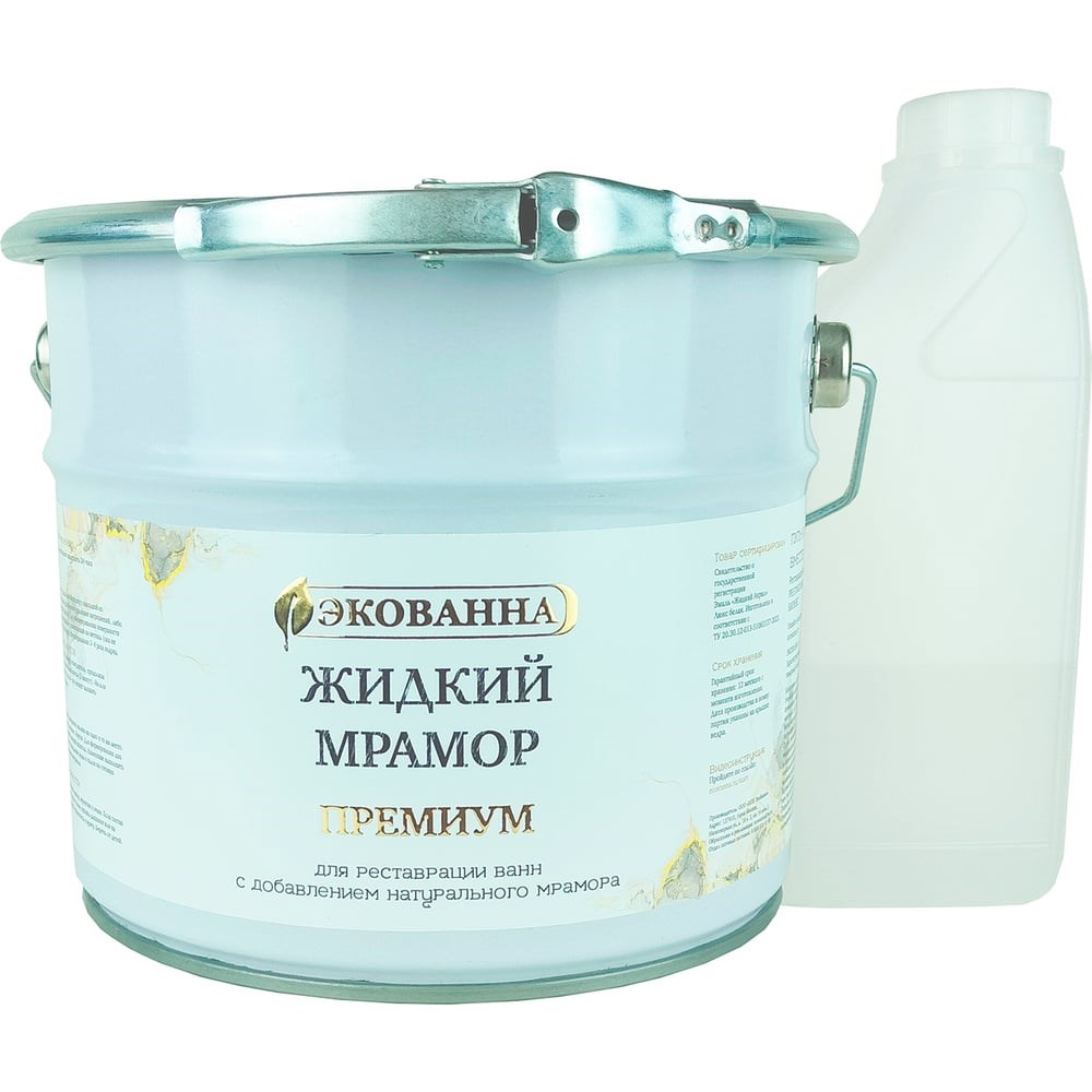 Жидкий Мрамор ПРЕМИУМ, универсальный комплект на ванны 1.2 — 1.7м. Комплект состоит из 2-х компонентов – основы и отвердителя. Применяется для реставрации ванн в домашних условиях методом налива. Фасовка: железное ведро Комплект: основа и отвердитель Масса компонентов без упаковки: 3.39 кг (Основа:Отвердитель — 3000:390) Масса компонентов с упаковкой: 3.87 кг (Основа:Отвердитель — 3420:455) Плотность: 1.5 Пропорция: на 100 грамм основы, 13 грамм отвердителя Преимущества состава Очень белый Повышенная прочность Улучшенная адгезия Железное ведро для минимизации брака при транспортировке Рекомендации по работе с материалом: 5 минут перемешивайте основу. Вливайте отвердитель, продолжая перемешивание, до получения однородной массы (5 минут). После смешивания компонентов «настаивание» материала не требуется, сразу приступайте к нанесению покрытия. Нанесение выполнить в течение 10-40 минут. Соблюдение температурного режима (+21..+24°C) является частью технологии! Для уменьшения вязкости (большей текучести) допускается добавление ксилола до 60 грамм. Нагревание материала за пределы температурного режима (+21..+24°C) НЕ ДОПУСКАЕТСЯ. При нанесении эмали избегайте повторного налива. Лить необходимо в один проход, начиная с бортов. Характеристики состава Застывание за 24 часа. Изготовлен без применения растворителя. Минимальный запах. Наносится без потеков. Хорошая растекаемость. Высокая адгезия к поверхности. Отличная укрывистость, без просветов. Срок службы покрытия — до 15 лет.