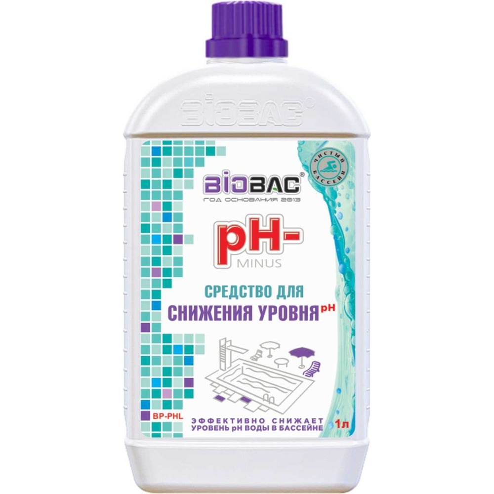 Средство для понижения уровня кислотности БиоБак pH- МИНУС жидкий BP-PHL применяется для понижения уровня рН в воде при механическом дозировании и в бассейнах с автоматическими станциями дозирования реагентов. Для понижения уровня рН на 0.1 следует растворить 100 мл препарата на 10 м3 воды. Оптимальное значение уровня pH для плавательного бассейна составляет 7-7.4.