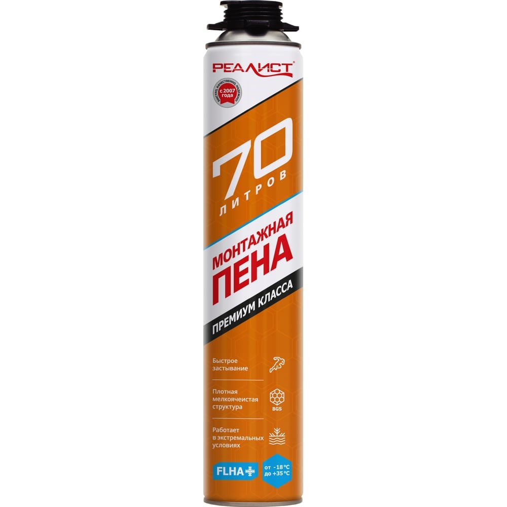 Пена монтажная REALIST PRO Orange 70 л, зимняя 4602009041068 - это ультра быстрое застывание и высокая производительность. Разработана с учетом экстремальных климатических условий применения и требований профессионалов. Монтажная пена REALIST максимально вспенивается на выходе из ствола пистолета, удобно укладывается в шов, максимально расширяется на начальном этапе, заполняя все неровности монтажного шва, и минимально расширяется на последнем этапе застывания. Применяется для герметизации и теплоизоляции швов при установке окон, дверей, подоконников и откосов, а также прочих швов, пустот, щелей, отверстий, для монтажа и изоляция проводки, технических и инженерных коммуникаций, соединения и герметизации различных строительных конструкций.