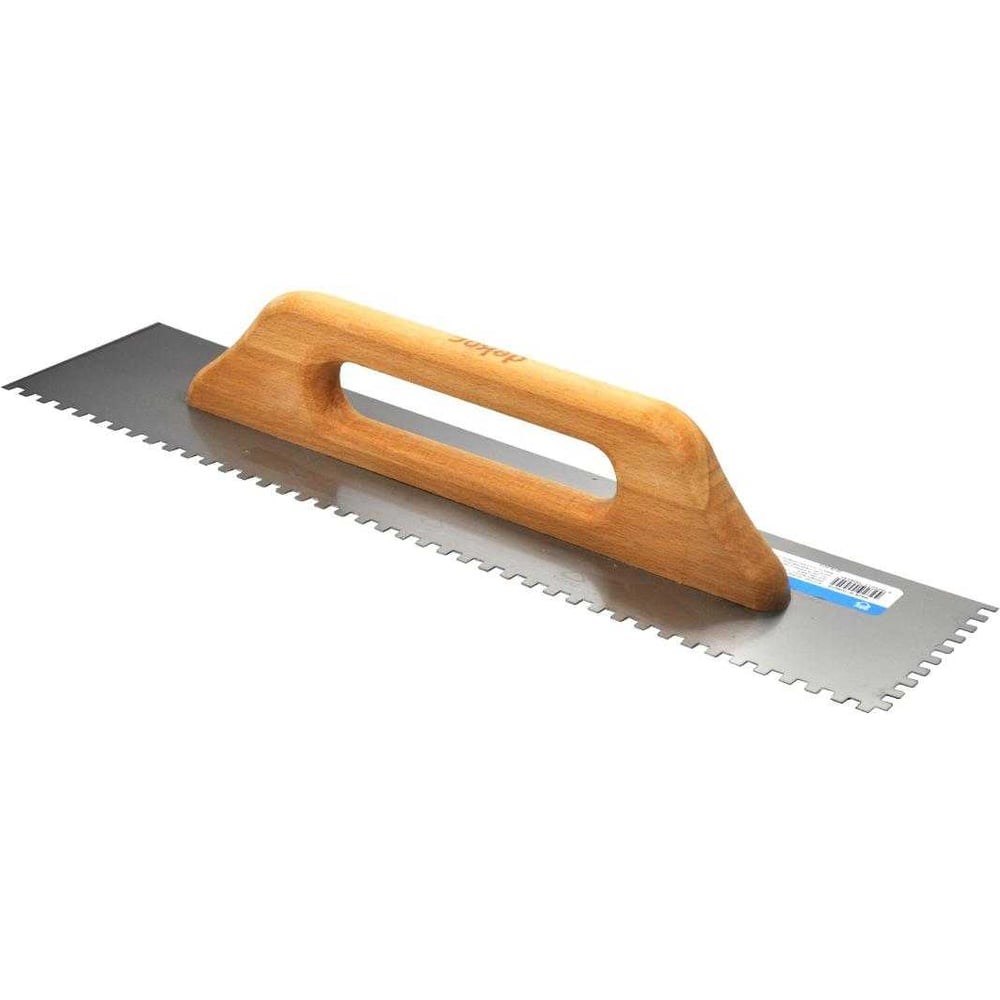Зубчатая гладилка с деревянной ручкой DEKOR HASSAN 120 х 500 мм 454, квадратный зуб 6 х 6 мм, предназначена для разравнивания строительной или клеевой смеси. Полотно с зубьями 6х6 мм изготовлено из пружинной стали. Инструмент обладает удобной для держания деревянной рукояткой.
