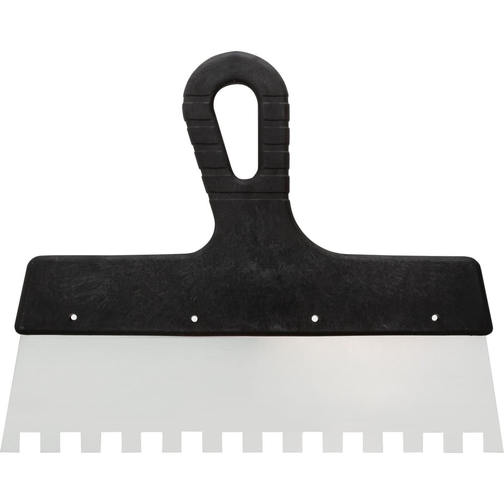 Зубчатый шпатель используется для кладки плитки. Инструмент применяется для разглаживания и расчесывания клея, который помогает крепить плитки к основанию. Полотно из нержавеющей стали отличается высокой прочностью и долговечностью. Эргономичная пластмассовая ручка служит для комфортной работы.