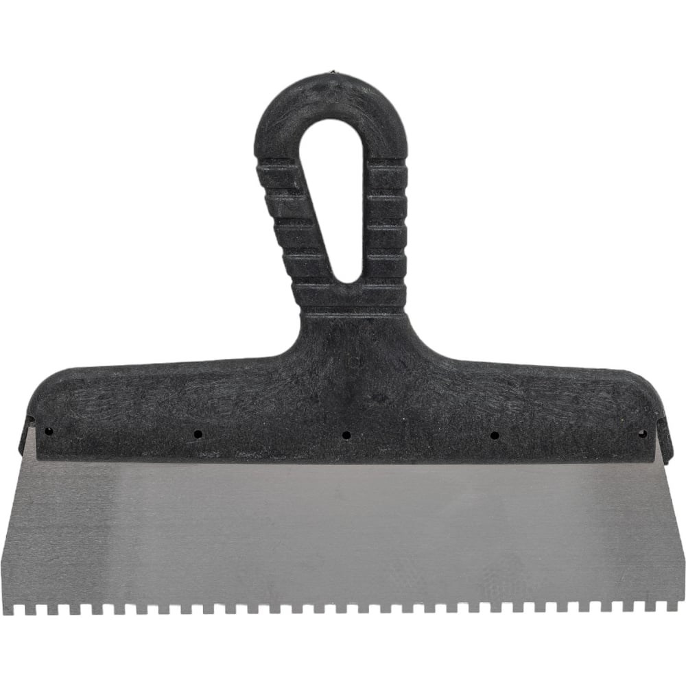Зубчатый шпатель предназначен для равномерного нанесения клеевого состава при укладке плитки, мозаики и т.д. Квадратные зубья облегчают нанесение клеевого состава, позволяя ровно и экономно распределять его по поверхности. Зубья размером 4х4 мм рассчитаны на плитку площадью 50-100 см2. При изгибающих нагрузках шпатель быстро восстанавливает свою форму. Рабочее полотно выполнено из нержавеющей стали, что обеспечивает коррозионную стойкость. Инструмент имеет эргономичную рельефную ручку. Рукоятка выполнена с небольшим наклоном для комфортного нанесения и выравнивания растворов. В рукоятке предусмотрено отверстие для подвешивания шпателя.