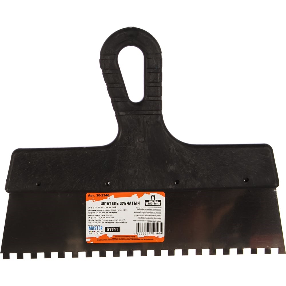 Зубчатый шпатель 250 мм 6х6 мм, нержавеющая сталь, пластиковая ручка MASTER COLOR 30-2346 используется для выравнивания слоя клея перед укладкой плитки. Инструмент оснащается гибким лезвием, которое упрощает работу с составами различной плотности. Внимание, иллюстративное фото. Представленная модель может отличаться.